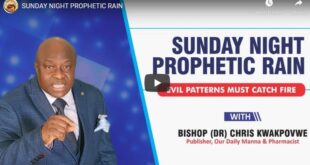 Live Stream this Sunday NIGHT PROPHETIC RAIN With Bishop Dr Chris Kwakpovwe ALSO – Our Daily Manna 22 February 2021- LESSONS FROM THE GRAVEYARD! CLICK THE PLAY BUTTON BELOW TO WATCH LIVE AMEN FOLLOW ON IG: https://www.instagram.com/ourdailymanna_bishopchris/ TONIGHT 8PM- PROPHETIC RATN/WARNING SERVICE Theme: “EVIL PATTERNS MUST CATCH FIRE” Connect Via Youtube: …